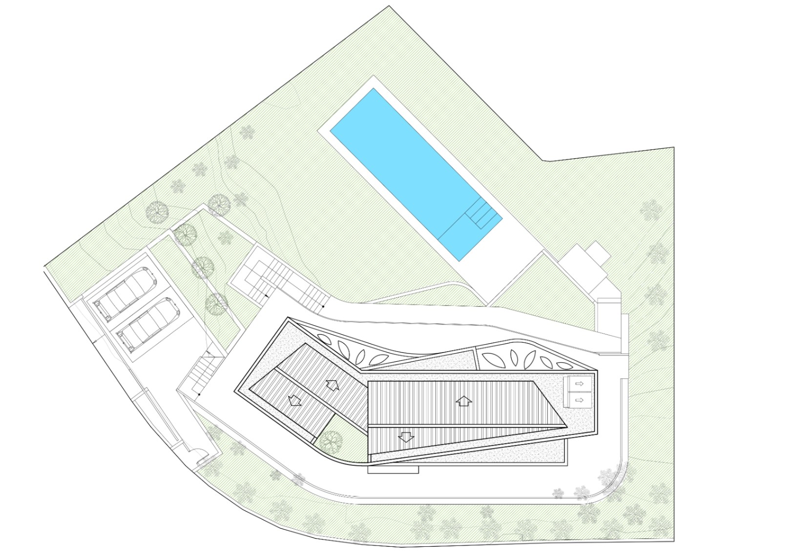 Der Garten ist pflegeleicht angelegt mit einheimischen Pflanzen, Kunstrasen und Natursteinmauern, die die Terrassen voneinander trennen. Das Grundstück ist vollständig mit Mauern und Zäunen umgeben. Es gibt einen doppelten Carport mit elektrischem Tor und einen zweiten Zugang.