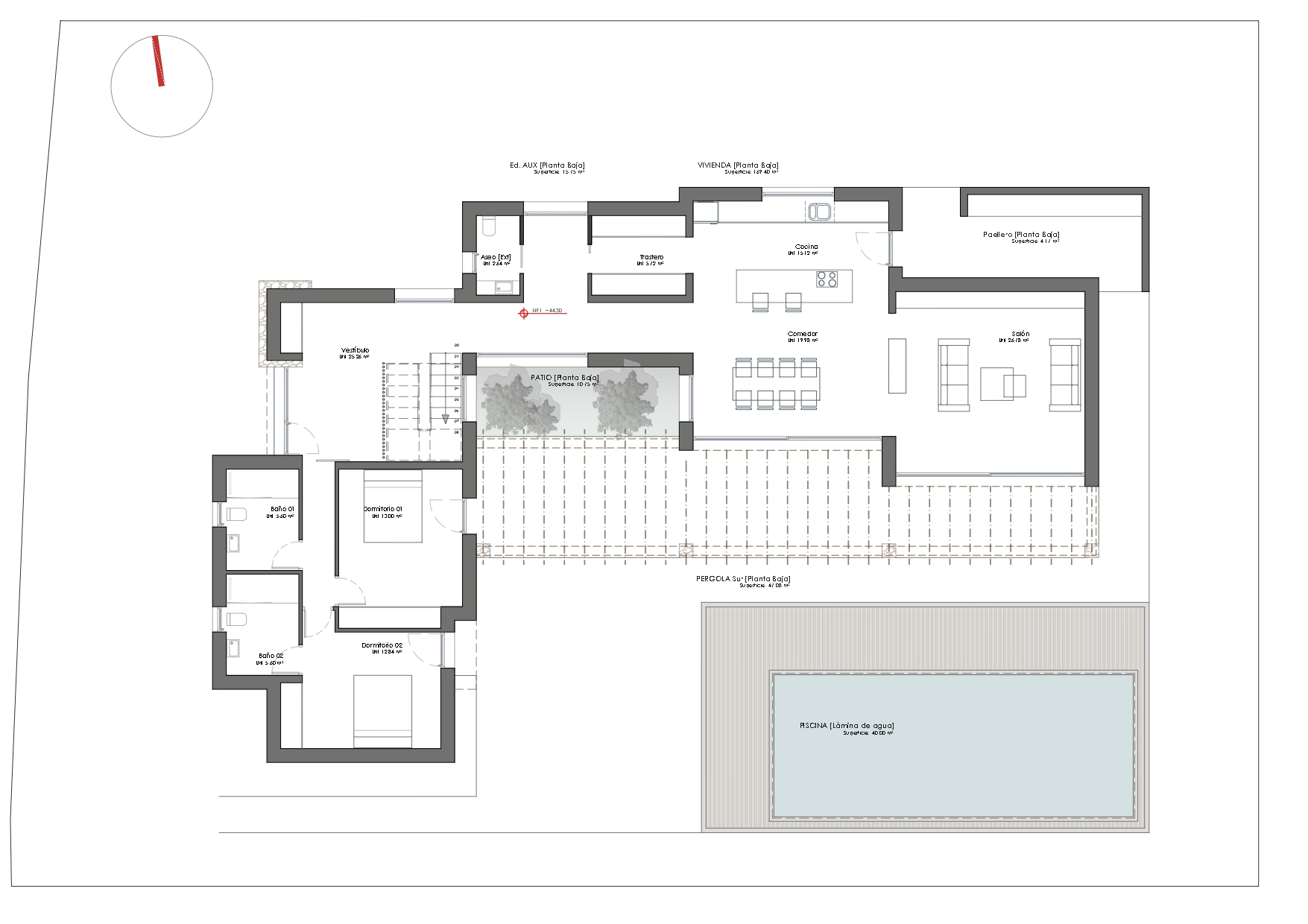 Die Villa wird auf drei Etagen gebaut und ist großzügig geschnitten. Auf der Ebene des Pools befindet sich ein geräumiges offenes Wohn- und Esszimmer mit direktem Zugang zur Terrasse. Angrenzend befindet sich die voll ausgestattete offene Küche mit Arbeitsinsel und Frühstückstheke. Auf dieser Etage befinden sich auch zwei Schlafzimmer, jedes mit eigenem Bad, eines davon en-suite. Außerdem finden Sie hier eine Gästetoilette und einen praktischen Hauswirtschaftsraum/Abstellraum. Im Obergeschoss befinden sich zwei weitere Schlafzimmer, beide mit eigenem Bad und Ankleidezimmer. Unter dem Haus befindet sich eine separate Etage mit Garage. Vom Wohnzimmer aus gelangt man direkt auf die Poolterrasse. Die Holzpergola und die Natursteinelemente verleihen der Villa einen stilvollen Ibiza-Look. Über die Küche gelangt man in die Sommerküche. Die Villa verfügt über Meerblick und ist unter anderem mit Heizung, Klimaanlage über Kanäle, Doppelverglasung und einer Sicherheitstür ausgestattet.